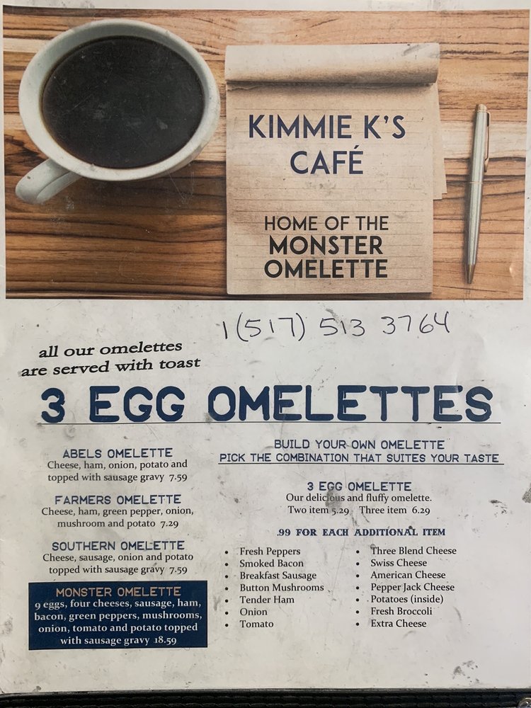 Welcome to Kimmie K's Cafe, a delightful eatery nestled at 4540 Page Ave in Michigan Center, MI. This charming cafe specializes in a mouthwatering menu that spans from fluffy waffles to hearty sandwiches and satisfying burgers, offering a true taste of American comfort food.